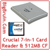 Crucial is a name synonymous with high quality system memory, which has been expanding their product line to include a variety of flash memory devices, such as the Gizmo! USB flash drive recently reviewed at BigBruin.Com.  Continuing our look at Crucials flash memory products, we now have their 7-in-1 Card Reader, as well as their 512MB CompactFlash card.  With so many formats of flash media available, the Crucial 7-in-1 Card Reader is a means to simplify your life, by allowing you to read the majority of the available formats with this one device.  And, one of the formats the card reader supports is CompactFlash, making it the perfect companion for the other review item, the 512MB CompactFlash card.