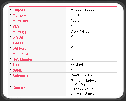 In addition to the specifications listed above, it should be noted that the .13 micron RV360 core clock boasts a speed of 500 MHz, and the DDR memory clock speed comes in at 600 MHz. Basically the default speeds for a Radeon 9600XT card, although I have seen Sapphire and PowerColor cards clocked higher on the memory side, perhaps using similar DDR and taking greater advantage of all the speed available.