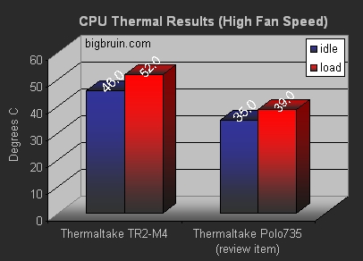 To say the least, the performance of the Thermaltake Polo 735 was impressive. Obviously the Polo 735 is a great improvement over one of Thermaltake's previous models (The TR2-M4, reviewed here). Temperatures are down at least 9 degrees C across the board, both idle and load temperatures when compared to the older model. As you can see in the graphs above, even at the lowest fan speed, the highest temperature the processor was ever exposed to was 46 degrees C at load. Now with all of this said, we do have to acknowledge our results could be slightly skewed. The brand of thermal paste, application, presence of dirt or other contaminants all can prevent heatsinks from showing their true results. This may be the case with the previously reviewed Thermaltake TR2-M4.