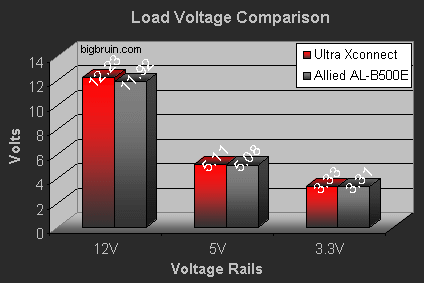 As you can see by the data presented, both power supply units provide results well within the generally accepted +/-10% tolerance, and easily handle the load placed on them. The Ultra Products Xconnect unit does provide slightly stronger readings on the 3.3V and 5V rails, while the advantage on the 12V rail is far more substantial. What the chart can not convey is the stability of the readings that are reported. The Ultra Products readings were nearly static during testing, with fluctuations of only a few hundredths of a volt on the 12V and 5V line. Meanwhile, the Allied power supply's 12V rail was very active while under load, swinging from a low of 11.86V to a high of 12.41. The stability of the Xconnect's rails was very impressive.