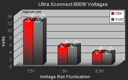 As a point of reference, the Ultra Products Xconnect's load voltage readings are charted against the idle voltage readings below. The idle readings were obtained with only the Hardware Doctor application running for 15 minutes after a reboot.
