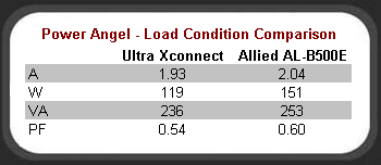 As a final phase of testing, the two power supplies were connected to the Seasonic Power Angel power monitor, and data was recorded with the systems in the loaded condition, as described previously. The chart below details the information provided by the Power Angel, and provides some interesting information...