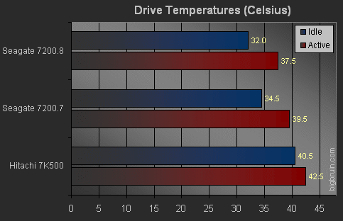 The Hitachi Deskstar 7K500 starts out much warmer than the two Seagate drives, and under activity it gets even warmer. The rise from Idle to Active conditions is less on the 7K500, but with such an elevated base temperature, that is of little comfort. The temperatures are not excessive, and could easily be dropped with even a mdoest cooling fan, but cooler electronics are generally happier electronics (longer life, more stable performance).