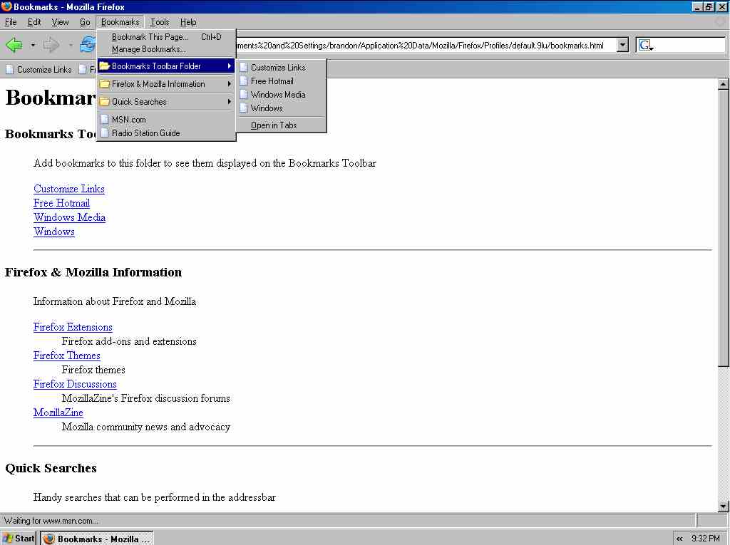 Thanks for the help so far but I still have not found what I am looking for and now this has become more of a challenge than something I just want to know. OK I took a screen shot of my Windows Explore screen. When I click on the file "Bookmarks" indicated by the red arrow