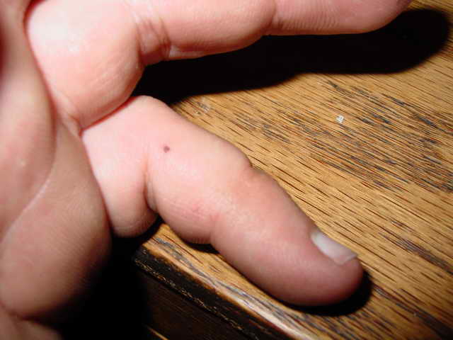 The first staple the thing ever fired went straight intothe side of my pinky finger.