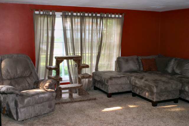 So,.... I've had the framing of this sit in my garage now for about 2 months now, PROMISING my daughter that I'd get it done. Well, the motivation finally came to me, and I got'er finished. I gave it that "piece de resistance" by wrapping it in reminants of the very same carpet that my living room has. The cat's immediately took to it and slept on it for a few hours. As soon as I came in the room to take pics, they huddled around my legs, hence why they weren't on it. Wink