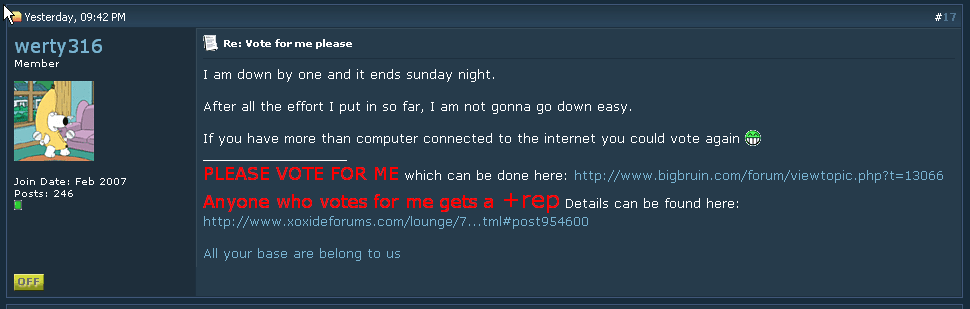 You think others never did the same but not in other forums like I did? Why else do you think there are alot of new users with no posts who just happen to join while there was a contest that requires membership to vote?