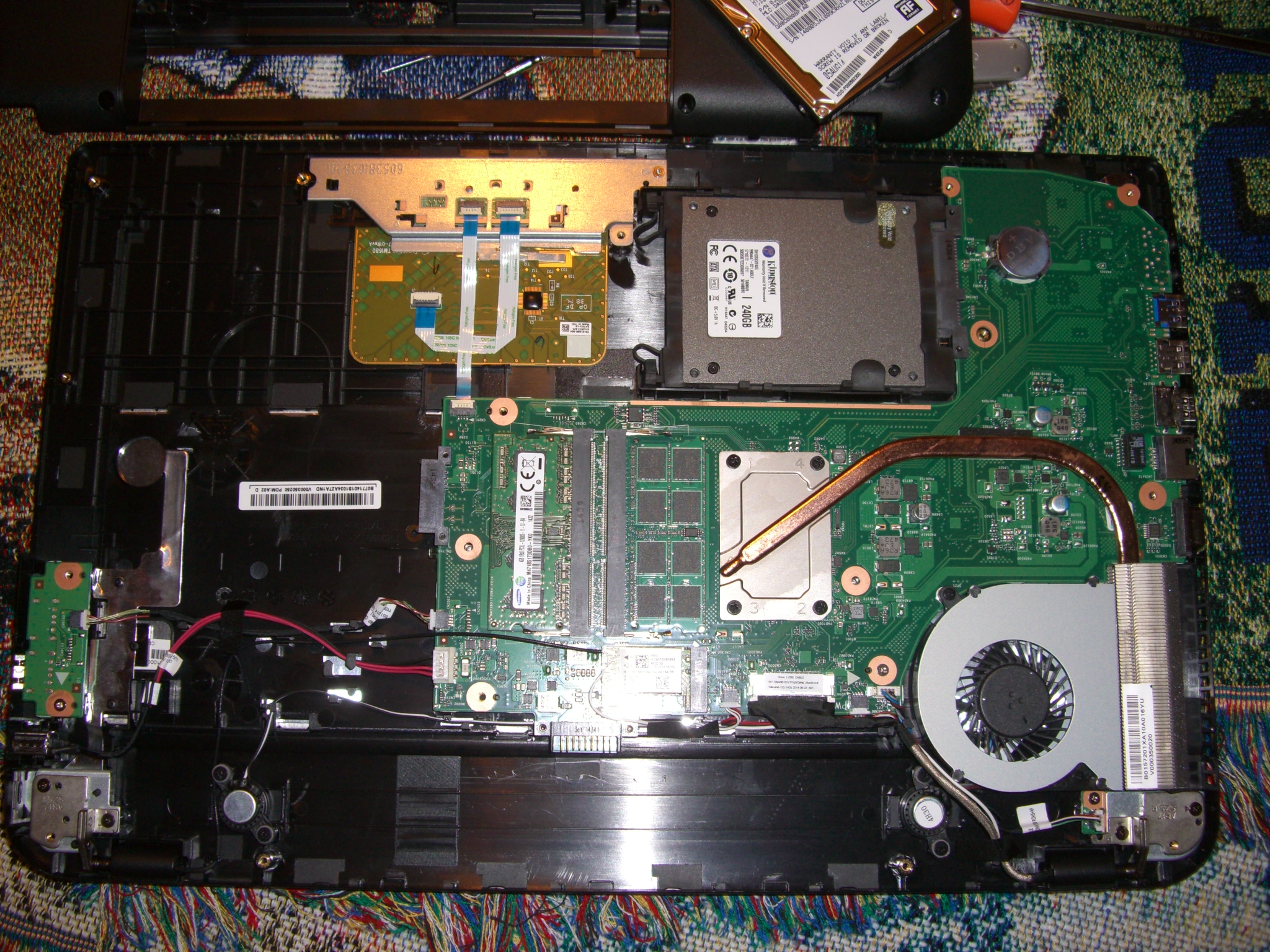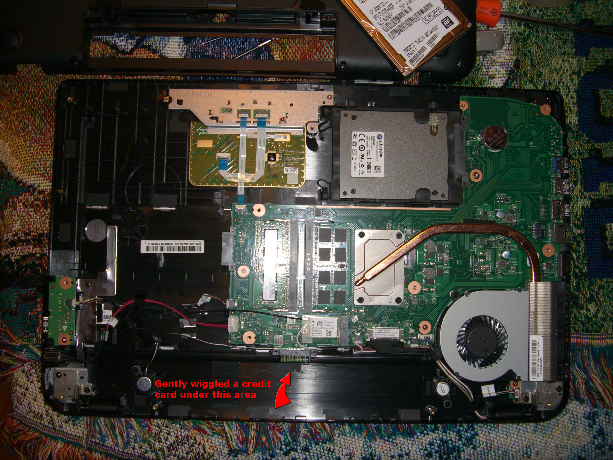 I bought a 'budget friendly' laptop on Friday for the wife and kids... Didn't have to be much, but I can't stand tiny and/or low-res screens. The Toshiba Satellite C75D-B7304 was on sale at Best Buy for $299, so I snagged that with its 1600x900 17.3" screen, 4GB DDR3, 1TB HDD, etc... I saw the HDD was 5400RPM, so I knew that was getting yanked for one of the SSDs I have on hand (wound up getting a 240GB Kingston HyperX unit... All documents state this thing isn't user servicable, but I assumed I could at least get at the HDD.