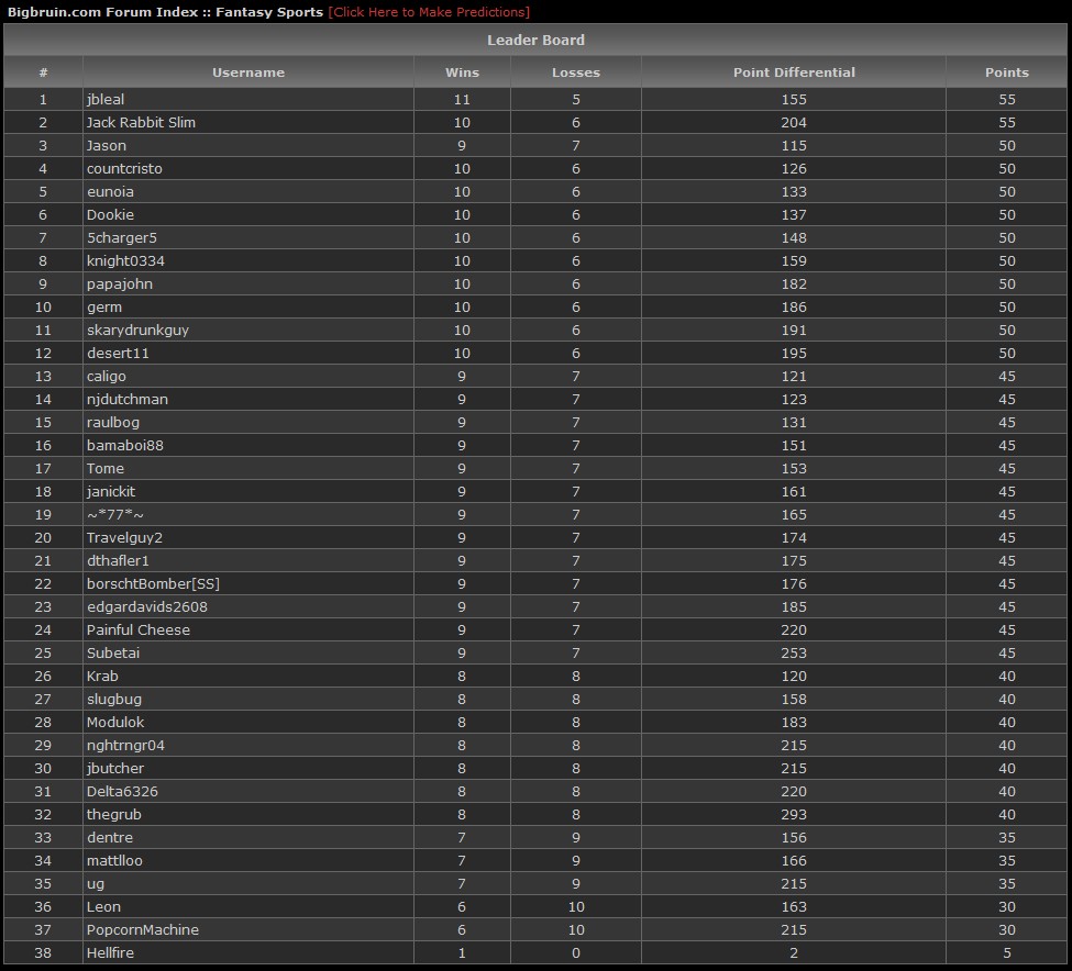 Congrats to jbleal for winning the week 3 pick 'em contest!